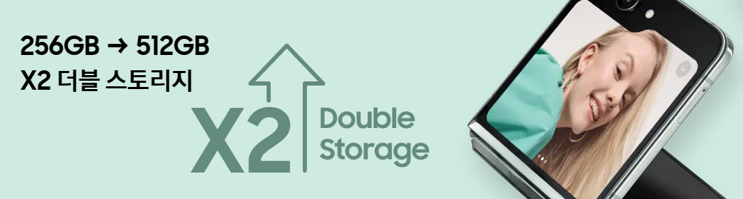 이번 갤럭시지플립5 사전구매혜택의 가장 좋은 것은 256GB 가격으로 512GB를 얻을 수 있는 더블스토리지에요