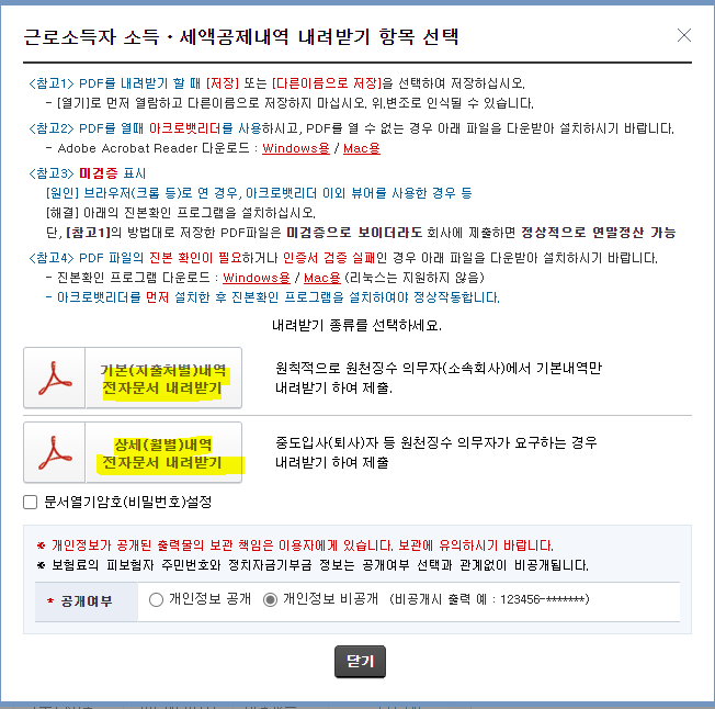 [PDF다운로드] 선택하시면 팝업창이 뜨고 문서 열때 암호 설정을 하실 수 있고, 주민번호 공개여부 설정 후 [전자 문서 내려받기] 버튼 선택해주세요