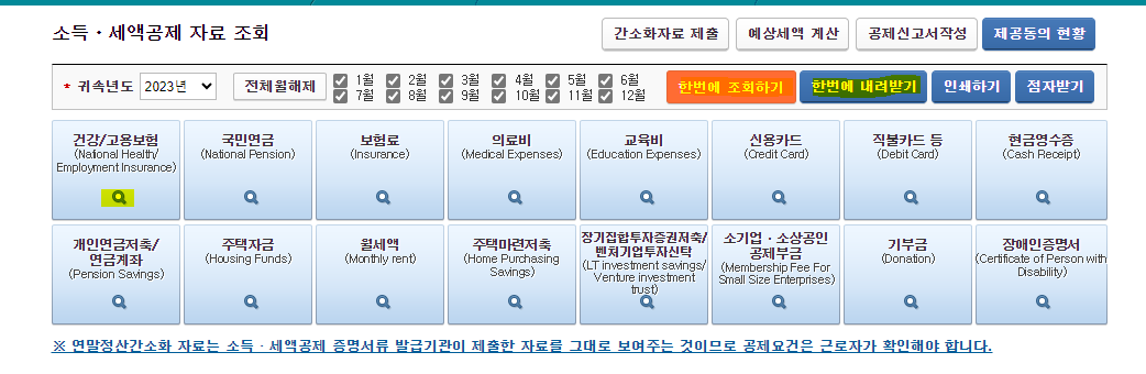 [한번에 내려받기] 선택하시면 공제 받을금액 있는 항목을 모아서 한 개의 PDF 파일로 한번에 다운받으실 수 있습니다