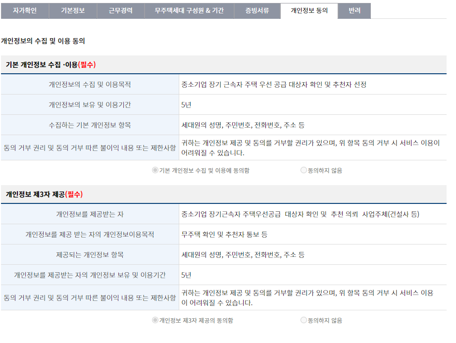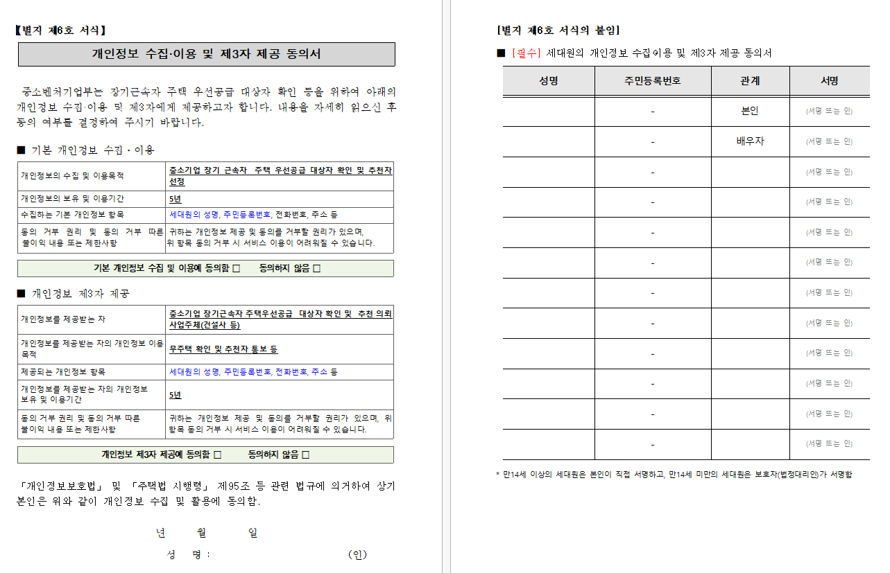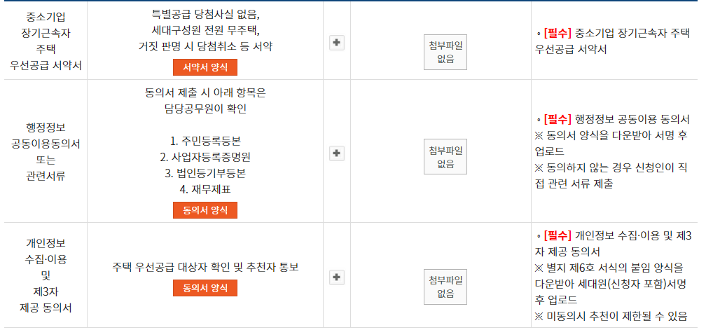 중소기업 장기근속자 주택 우선공급 서약서와 행정정보 공동이용동의서, 개인정보 수집.이용 및 제3자 제공동의서 제출하셔야 하며 양식이 업로드 되어있으니 다운 받으셔서 작성 후 다시 업로드 하시면 됩니다