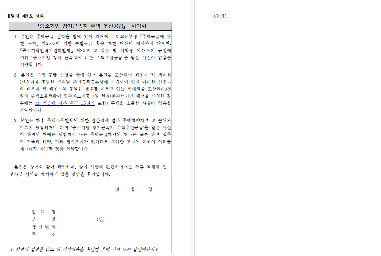 ▶ 중소기업 장기근록자 주택 우선공급 서약서