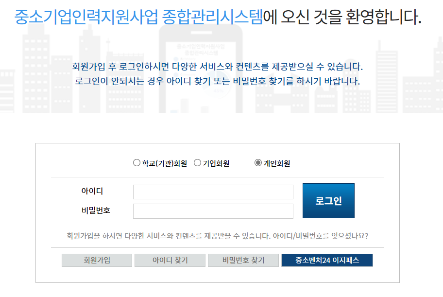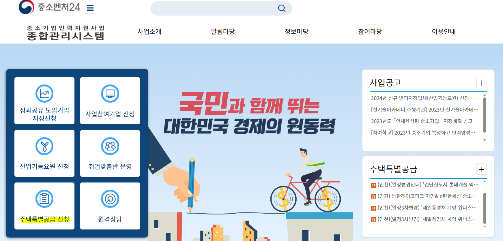 중소기업 기관추천 특별공급 신청하려면 중소기업 인력지원사업 종합관리시스템 사이트에서 신청 가능합니다