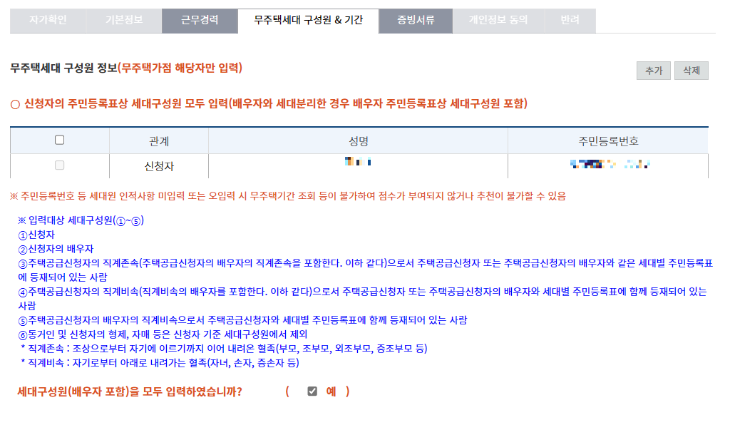 아래 세대구성원 모두 입력하였습니까 예 체크해 주세요
