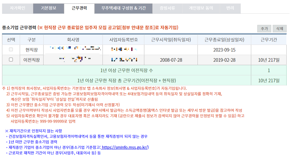 이전 중소기업 회사명과 사업자번호, 근무시작일과 근무종료일 그리고 현 재직 중인 중소기업 회사명과 사업자등록번호 근무시작일이 필요합니다