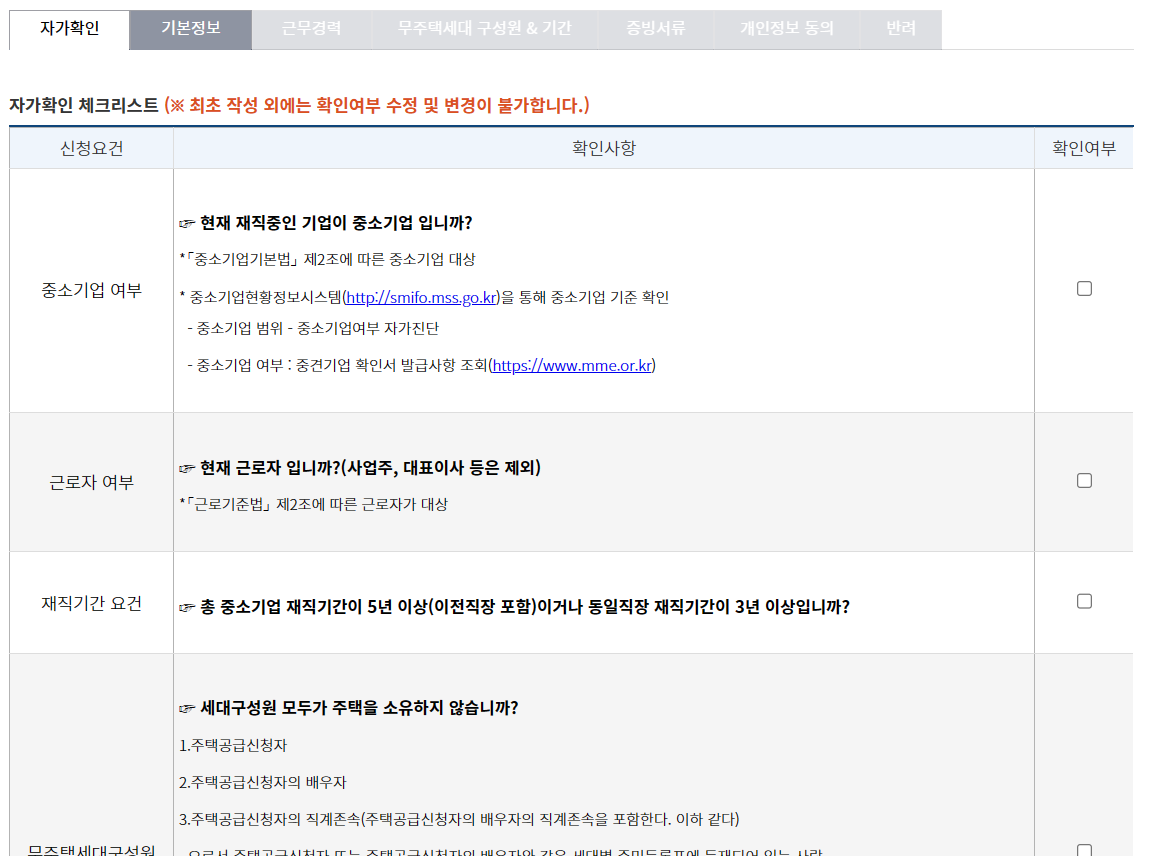 중소기업에 재직 중인지, 대표가 아닌 직원이 맞는지, 재직기간 요건을 채웠는지 무주택세대구성원인지, 특별공급 재당첨