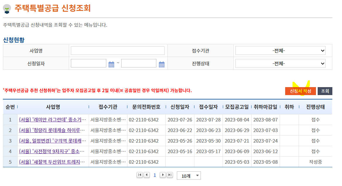 4. 기존 접수한 특공들이 보이고 오른쪽 주황색 [신청서 작성] 버튼 눌러주세요
