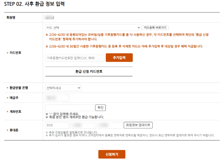 8. 사후 환급정보 입력 후 [신청하기] 눌러주세요