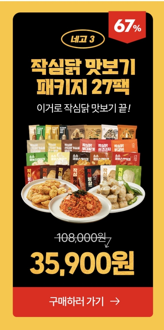작심닭 맛보기 패키지 27팩은 108,000원에서 67% 네고되어 35,900원 입니다