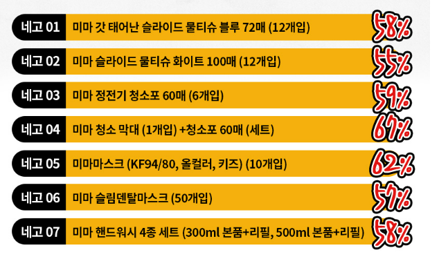마스크뿐만 아니라 이번에 새로 나온 물티슈와 청소포, 핸드워시 등 다양한 생활용품들이 50% 이상 할인율로 네고되었다고 해요
