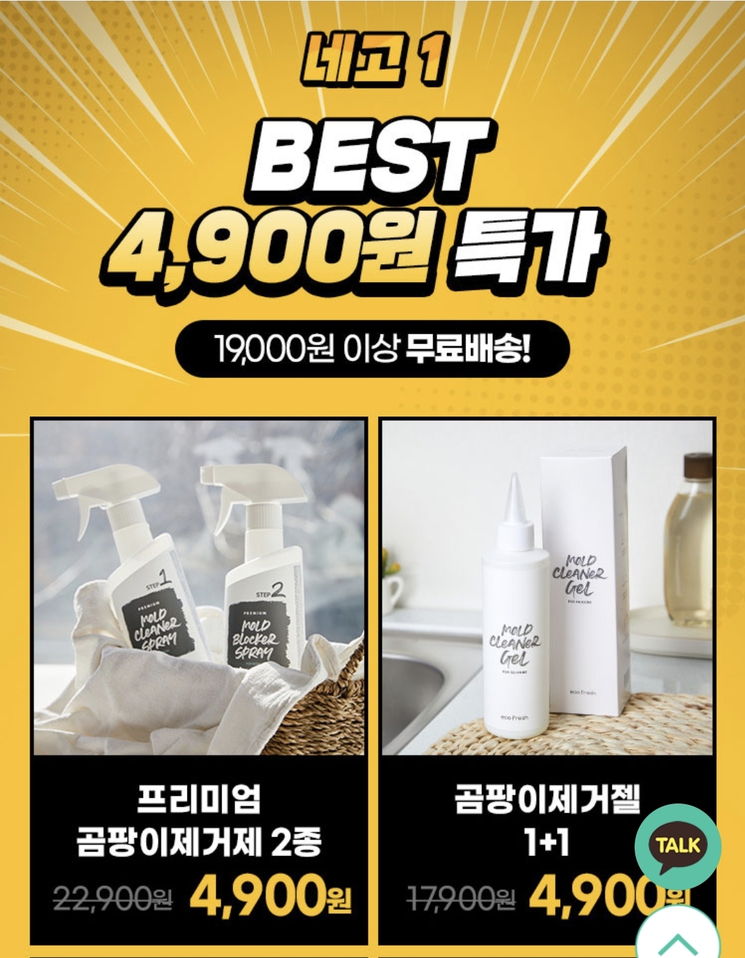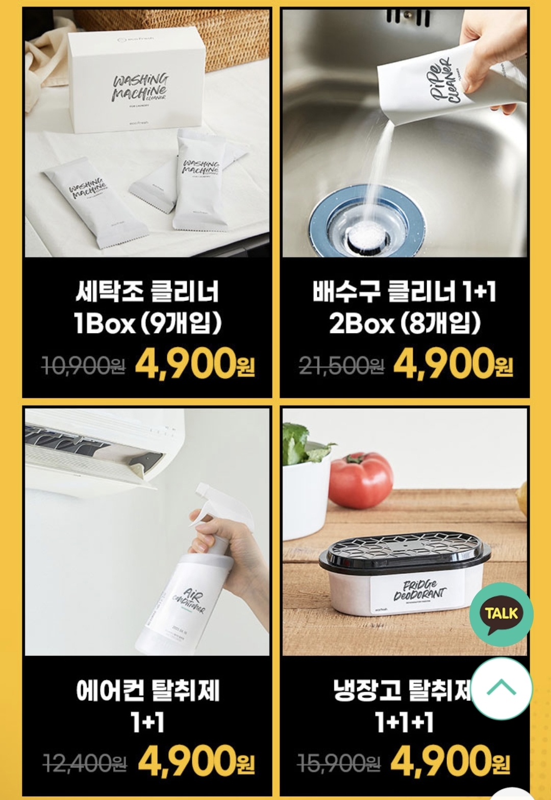프리미엄 곰팡이제거제 2종, 곰팡이제거젤 2개, 세탁조클리너 1BOX(9개입), 배수구 클리너 2개, 에어컨 탈취제 2개, 냉장고 탈취제 3개가 모두 각 4,900원입니다.