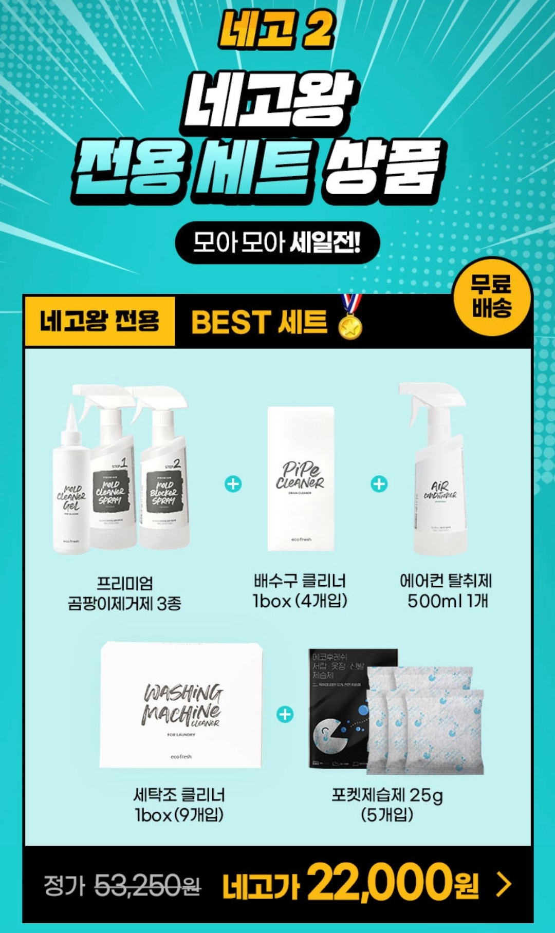 BEST 세트 구성품은 프리미엄 곰팡이제거제 3종 + 배수구 클리너 1BOX(4개입) + 에어컨 탈취제 500ML 1개 + 세탁조 클리너 1BOX(9개입) + 포켓제습제 25G(5개입) 입니다.