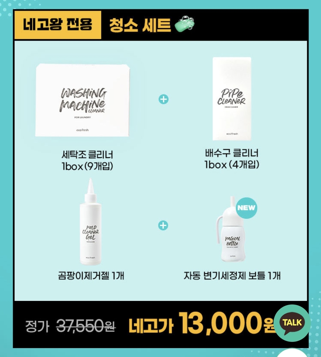 구성품은 세탁조클리너 1box(9개입) + 배수구 클리너 1box(4개입) + 곰팡이제거젤 1개 + 자동 변기세정제 보틀 1개 입니다.