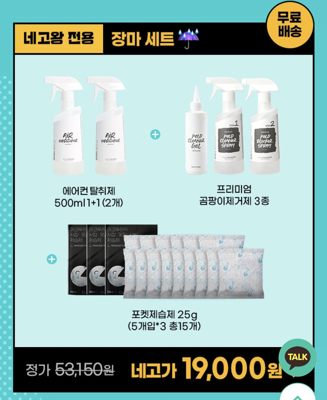 네고왕 전용 장마세트는 정가 53,150원이나 19,000원으로 네고했습니다.