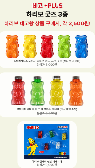 하리보 네고 1 & 2 상품 구매시 하리보 굿즈 3종을 각 2,500원에 구매할 수 있습니다