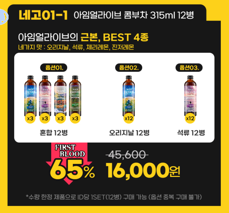 네고 1-1 ) 아임얼라이브 콤부차 315ml 12병 65%할인 16,000원
