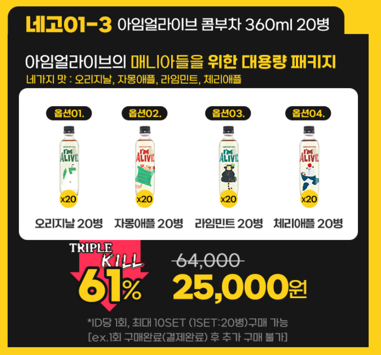 네고1-3) 아임얼라이브 콤부차 360ml 20병 61%할인 25,000원