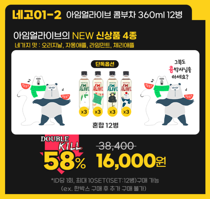 네고1-2) 아임얼라이브 콤부차 360ml 12병58% 할인 16,000원