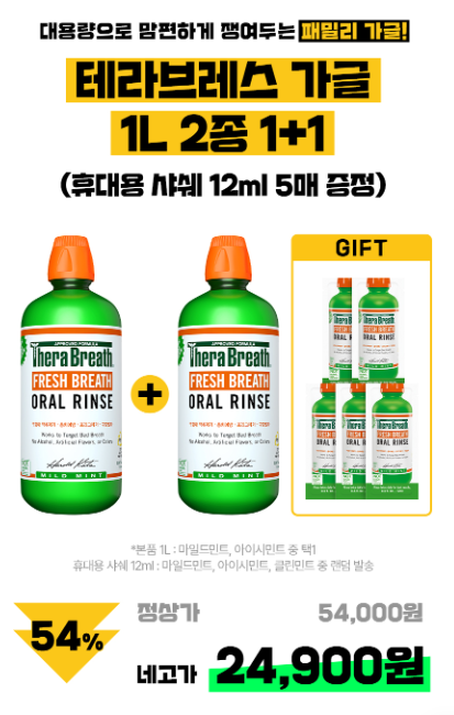 네고2 테라브레스 가글 1L 2종 1+1 54% 24,900원