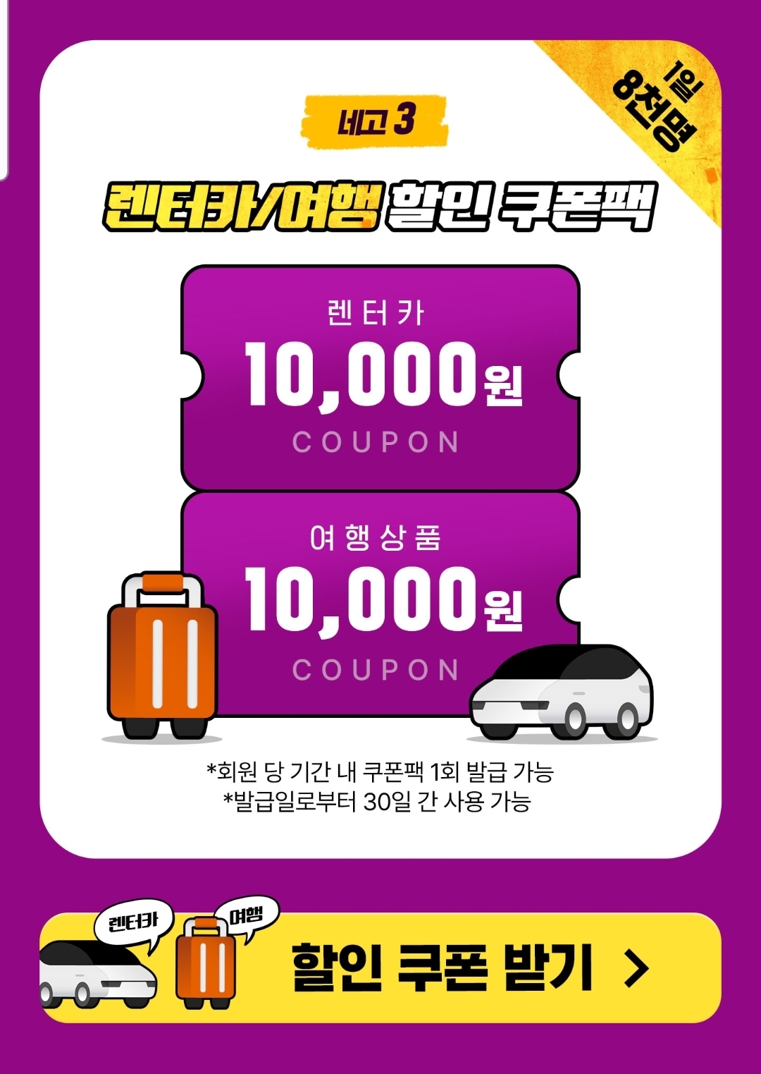 렌터카, 여행 각각 1만원 할인 쿠폰은 매일 선착순 8천명이에요