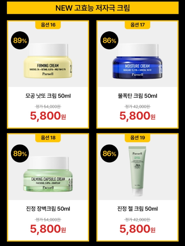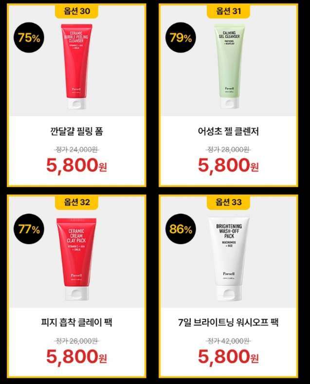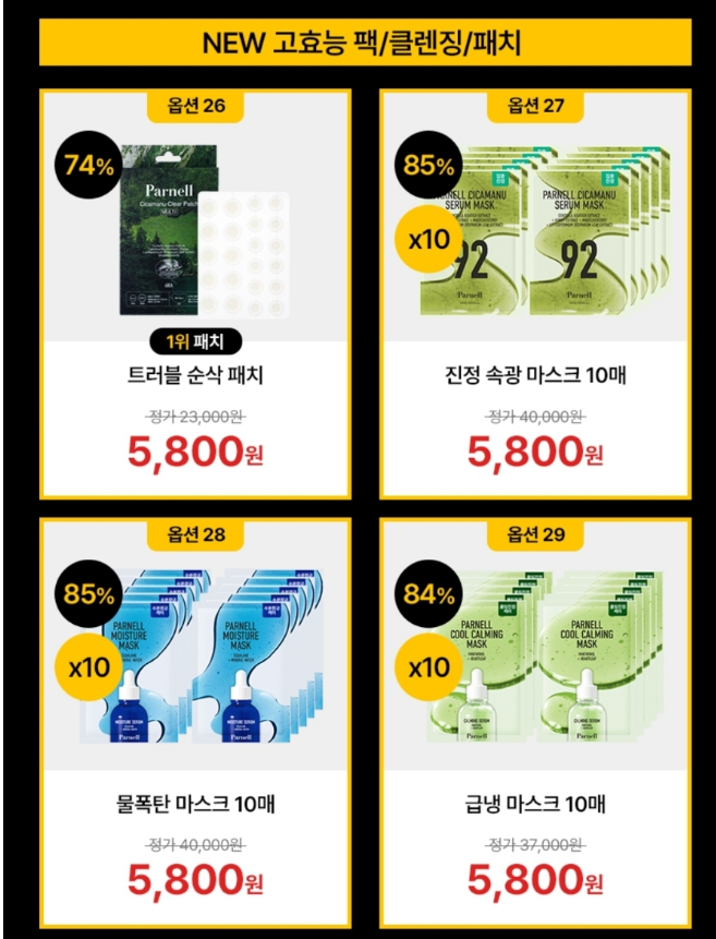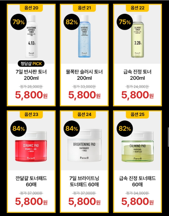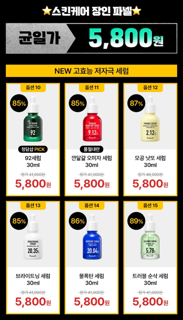 클렌저, 필링, 패드, 토너, 세럼, 크림, 마스크팩까지 스킨케어 장인 파넬의 기초 전제품도 5800원이에요
