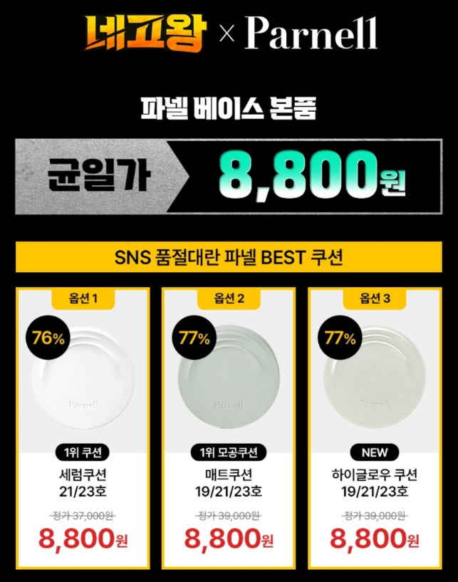 SNS 품절 대란 파넬 BEST 쿠션으로 세럼쿠션, 매트쿠션, 하이글로우 쿠션 3가지가 모두 8,800원이에요