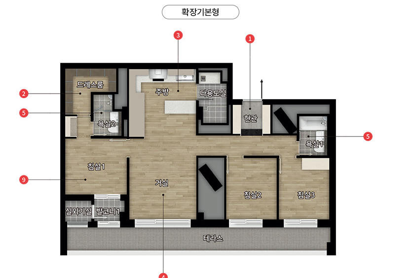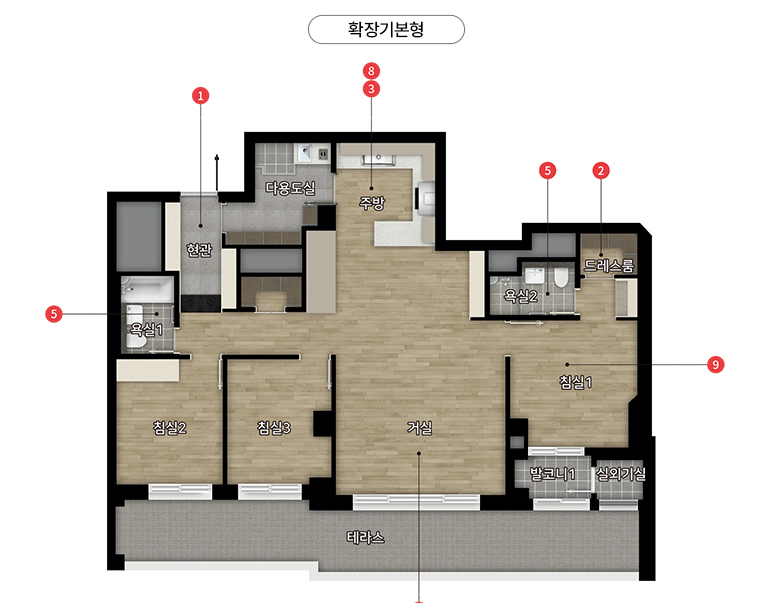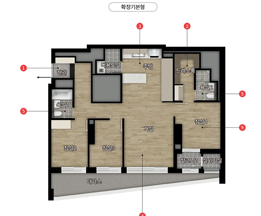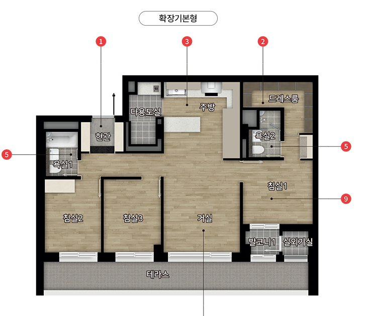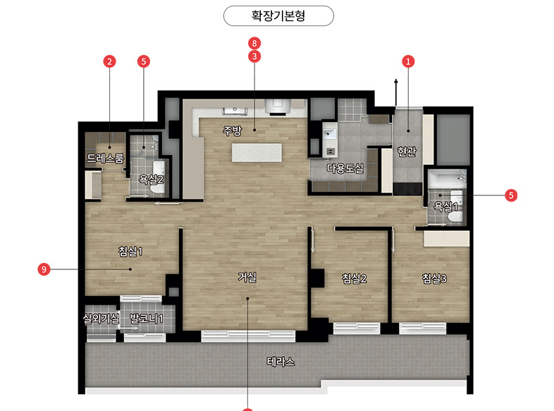 평면도를 보시면 많은 세대의 테라스가 있다는 것도 장점입니다
