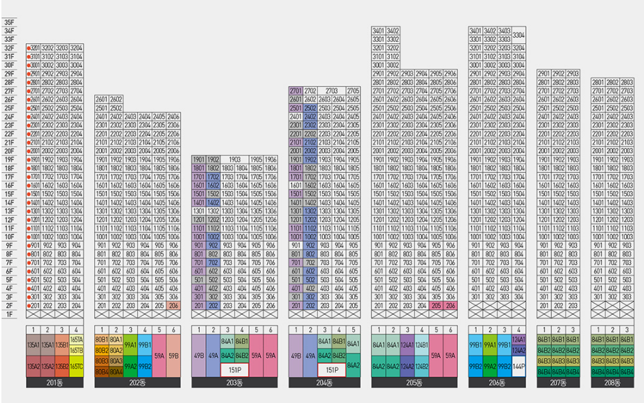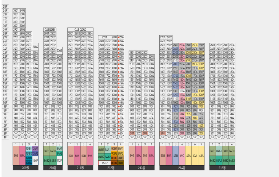 아파트 한 동 별 평형과 층이 표기되어 있으며 색깔 칠해진 평형과 층이 일반분양 대상입니다