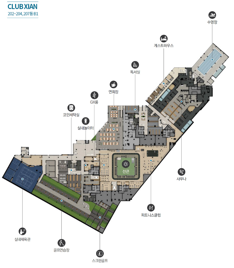 메이플자이 아파트 단지 오른 쪽 커뮤니티는 수영장, 연회장, 피트니스클럽, 골프연습장, 게스트하우스, 사우나, 실내체육관이 있고