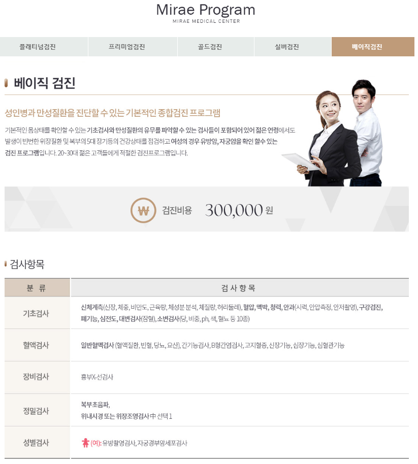 베이직검진이 기본적인 종합검진 프로그램인데 30만원으로 제일 저렴한 편이고 제일 비싼건 150만원이에요
