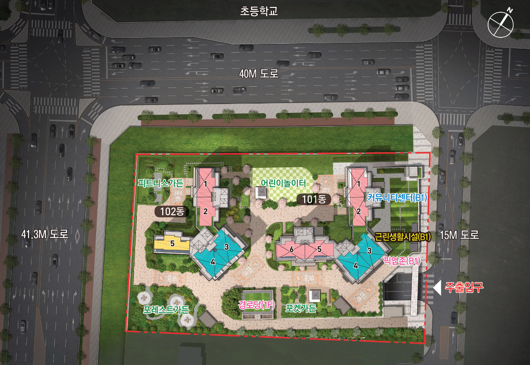 길건너에 초등학교가 있고 40M 도로를 끼고 있으며, 아파트 단지는 101동, 102동 2동입니다
