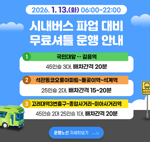 무료 셔틀버스 운행은 시내버스 중단된 구간에 파업기간 동안 한하여 인근 지하철역 연계하여 운행합니다