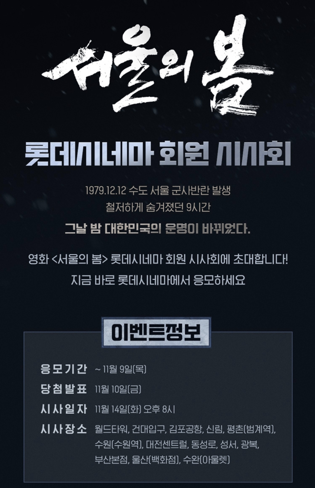 시사회 응모하실 분들은 아래 링크 통해 바로 이동하셔서 서울의 봄 시사회 이벤트 응모하세요