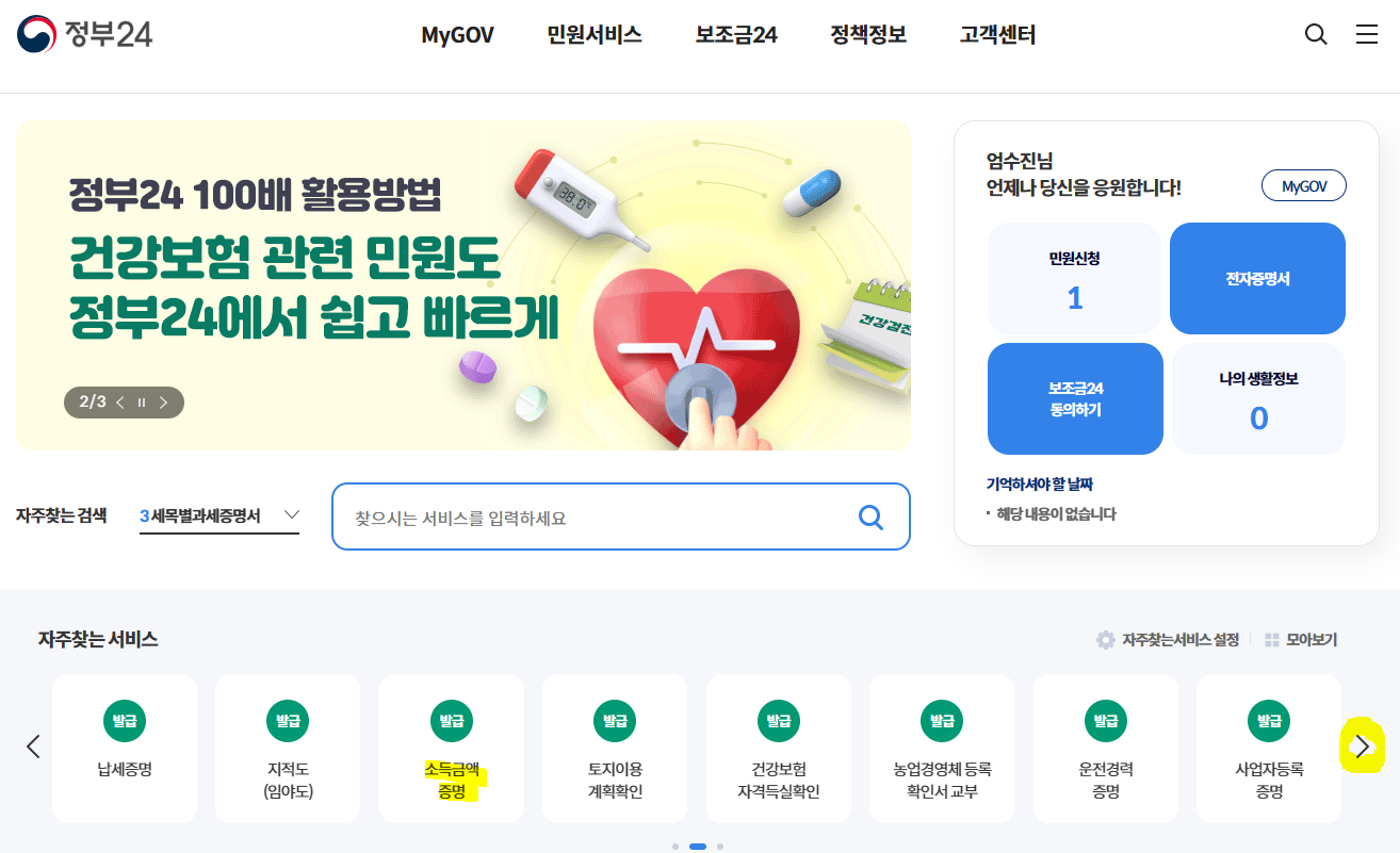 2. 정부24 첫화면 자주찾는 서비스에서 오른쪽 화살표 " > " 한번 누르고 소득금액 증명 선택해주세요