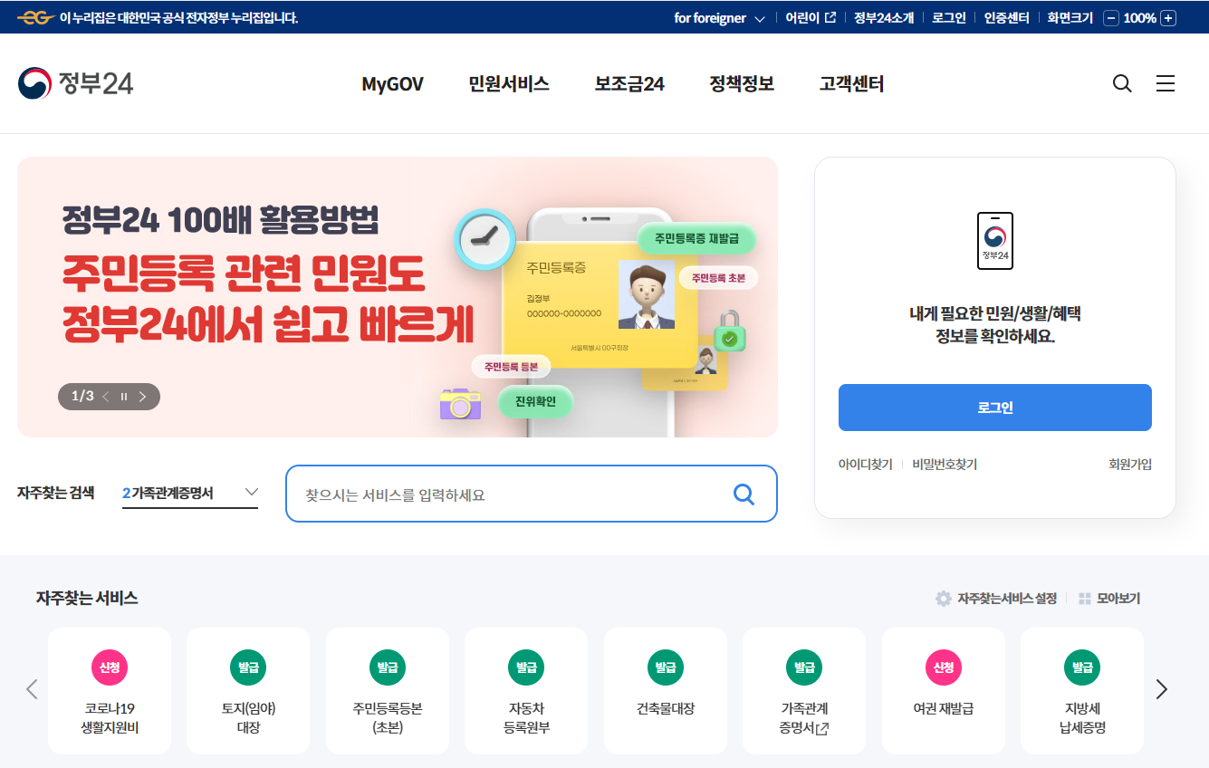 1. 정부24 홈페이지에서 로그인 해주세요(오른쪽 상단)