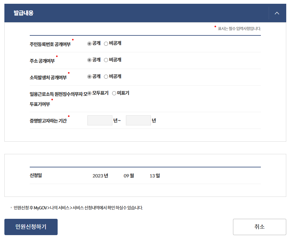 6. 발급내용에 공개여부 선택하고 민원신청하기 버튼 눌러주세요
