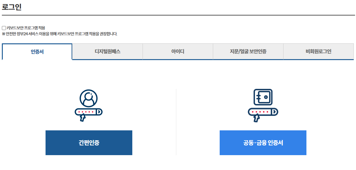인증서 로그인은 인증서를 정부24 홈페이지에 등록 후 이용 가능합니다
