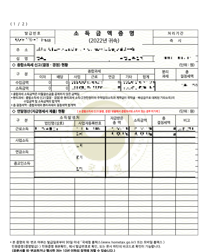 소득금액증명서는 종합소득 또는 연말정산 소득 또는 일용근로소득이 있는 사람이 과세된 소득에 대한 소득금액을 증명받을 때 필요한 서류이며 보통 대출시 요구되는 서류입니다