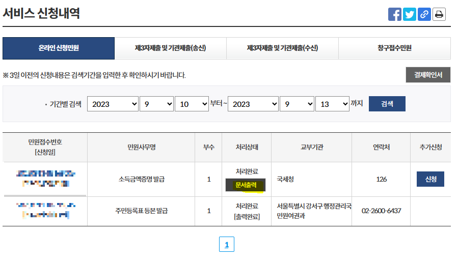 7. 서비스 신청내역에서 문서출력 버튼 눌러주세요