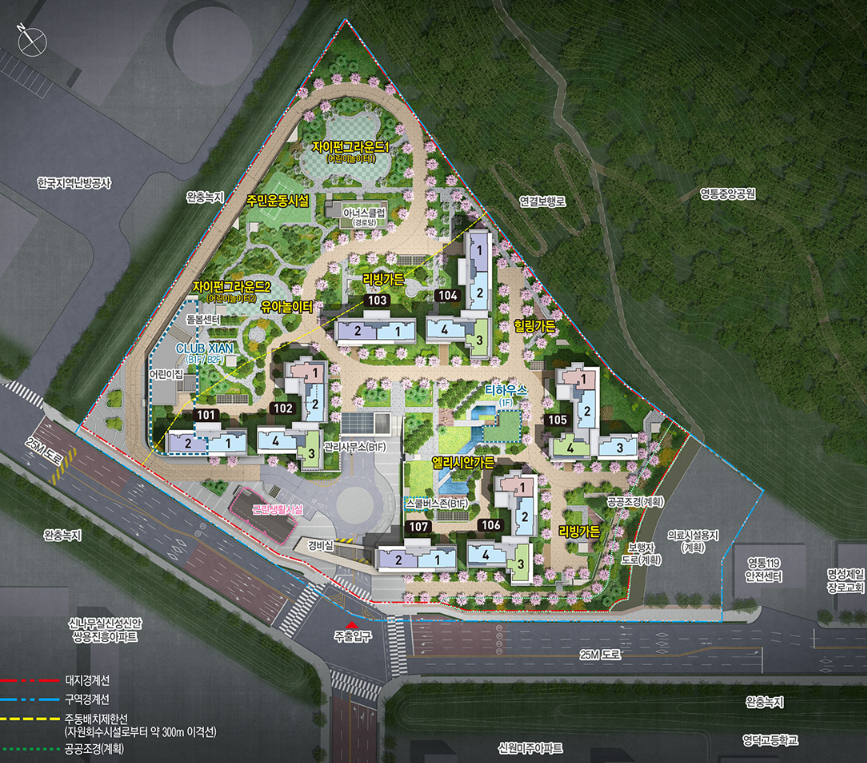 총 4개동으로 이루어져 있으며 자이펀그라운드1&2 (어린이 놀이터), 유아놀이터와 리빙가든, 힐링가든, 엘리시안 가든 등 아파트 단지 내 조경이 잘 꾸며질 듯 합니다.
