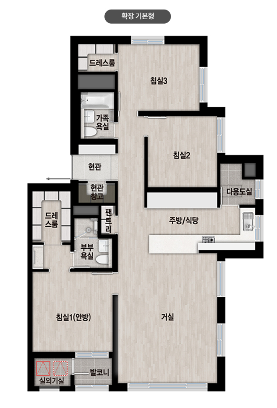 침실 3개, 화장실 2개, 드레스룸과 알파룸, 펜트리가 있으며 4bay 판상형 입니다