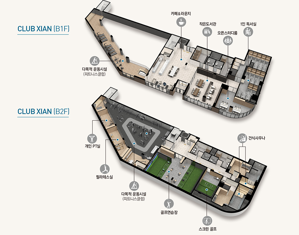 지하 2층에는 개인PT실, 필라테스실, 피트니스클럽, 골프연습장, 스크린골프, 건식사우나가 예정되어 있습니다.