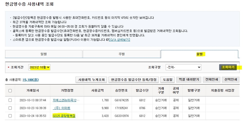 일별/주별/월별로 조회 가능하며 저는 월별로 선택하고 조회기간 선택 후 조회하기 누르니 자진발급한 현금영수증내역이 조회가 되었습니다