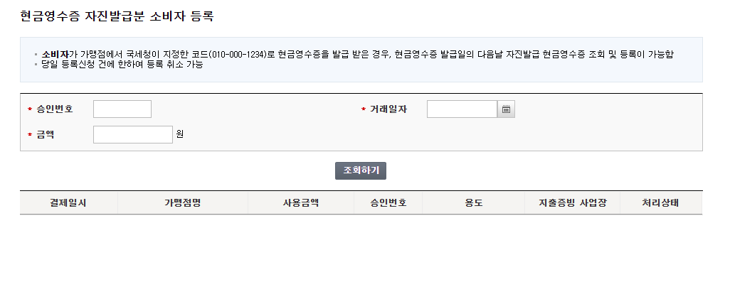 등록한 현금영수증은 자진 등록한 다음날부터 조회가 가능합니다