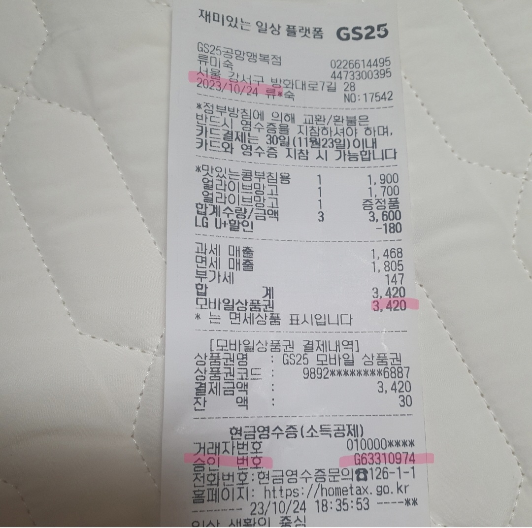 제가 모바일 상품권으로 편의점에서 구매 후 받은 영수증이에요