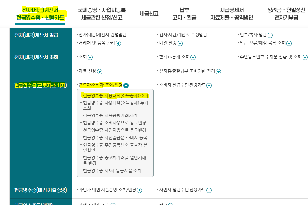 3. 메인화면에서 살짝 아래로 내려서 [현금영수증] 클릭해 주세요
