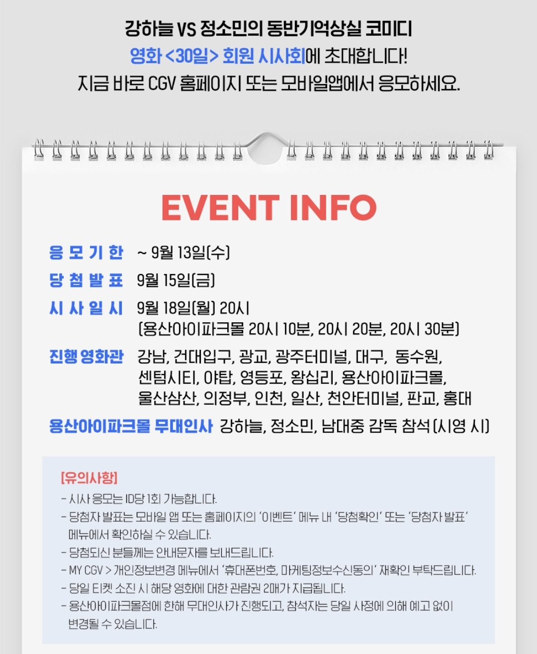 강하늘, 정소민 주연의 동반 기억상실 코미디 영화 '30일' 이 현재 CGV 에서 회원 시사 이벤트 중이에요