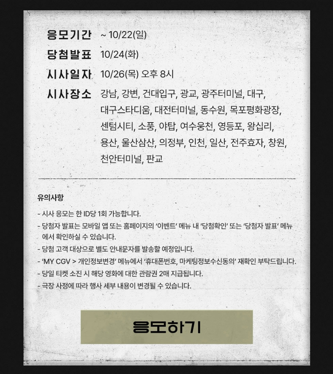 시사회 응모는 한 ID 당 1회 가능하며 당첨 시 안내문자 발송됩니다