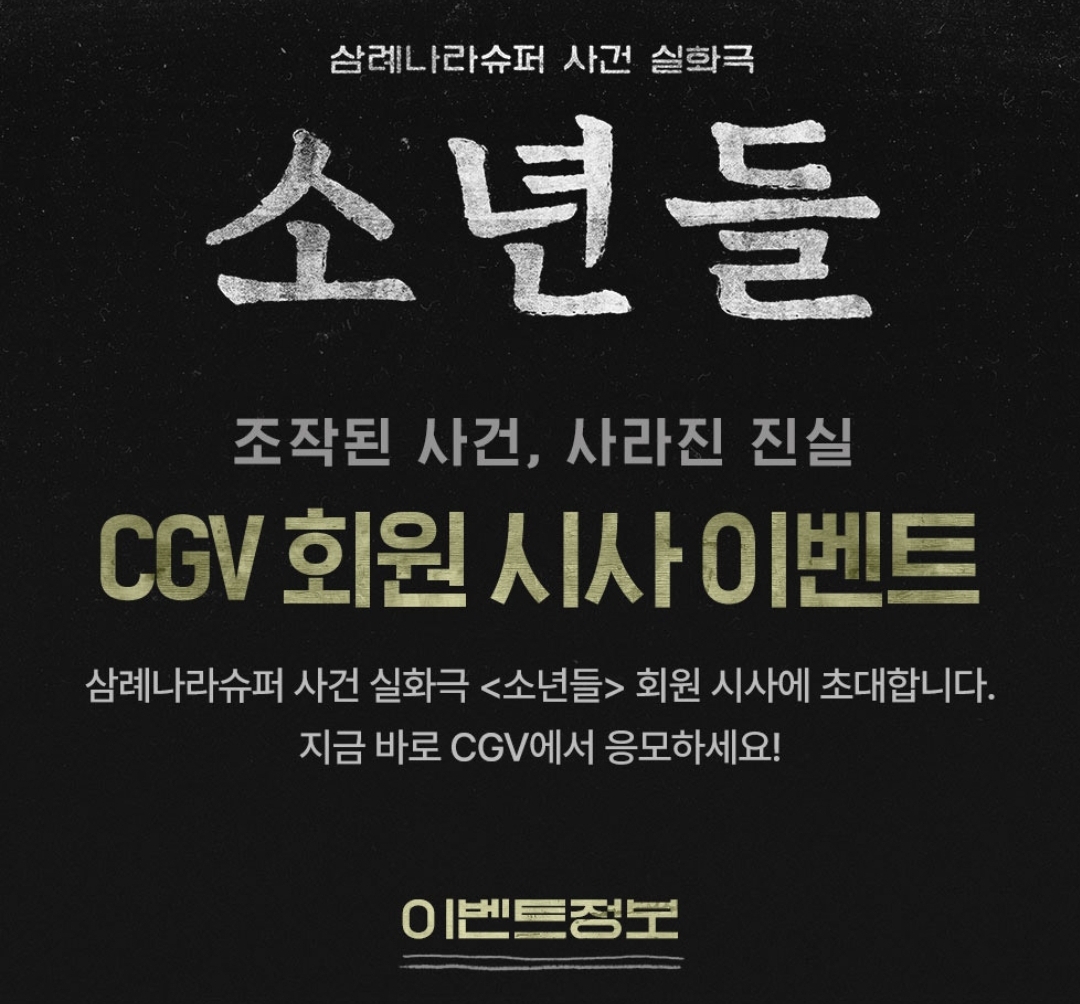 설경구, 유준상 주연의 삼례나라슈퍼 사건 실화극인 <소년들>이 23년 11월 1일 개봉을 앞두고 시사회 이벤트 진행 중입니다