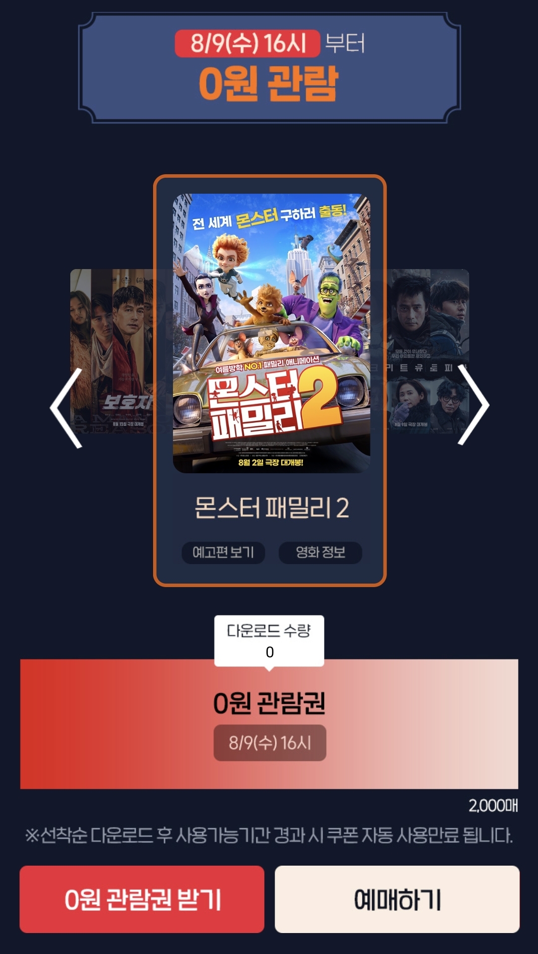 14시에는 달짝지근해 2천원 관람쿠폰 선착순 3000장 뿌리고 16시에는 몬스터패밀리2 0원관람권 선착순 2000명 뿌릴 예정이에요