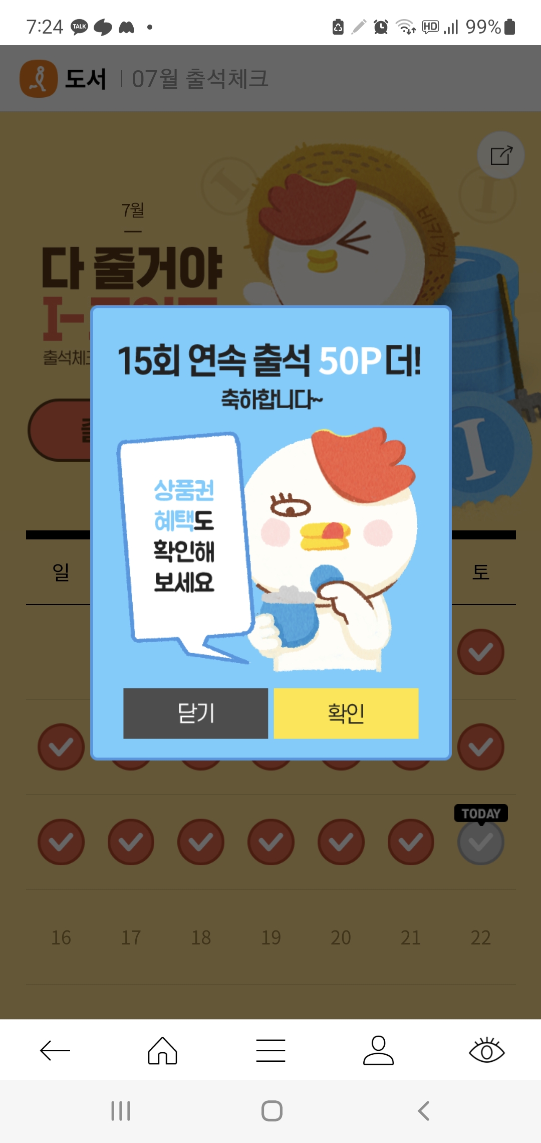 15일 연속 출석하면 100포인트 적립되고 한달 개근하면 300포인트 적립 받을 수 있어요